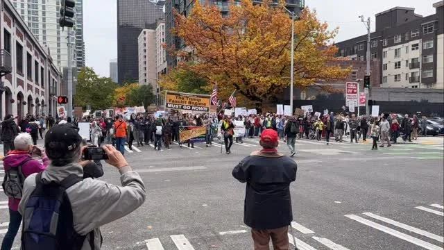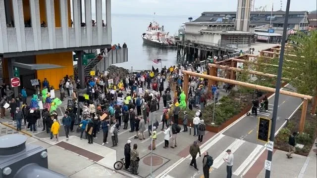 No Kings protest gathering at the Ferry Terminal. Mini protests are starting all over town marching toward Seattle Center while the big parade comes down from Capitol Hill. The crowd just doubled in the time I was writing this caption.